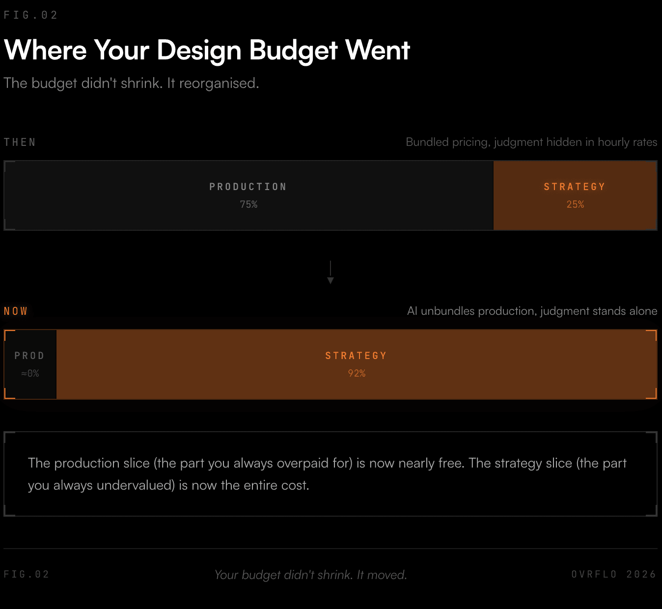 The production slice (the part you always overpaid for) is now nearly free. The strategy slice (the part you always undervalued) is now the entire cost.