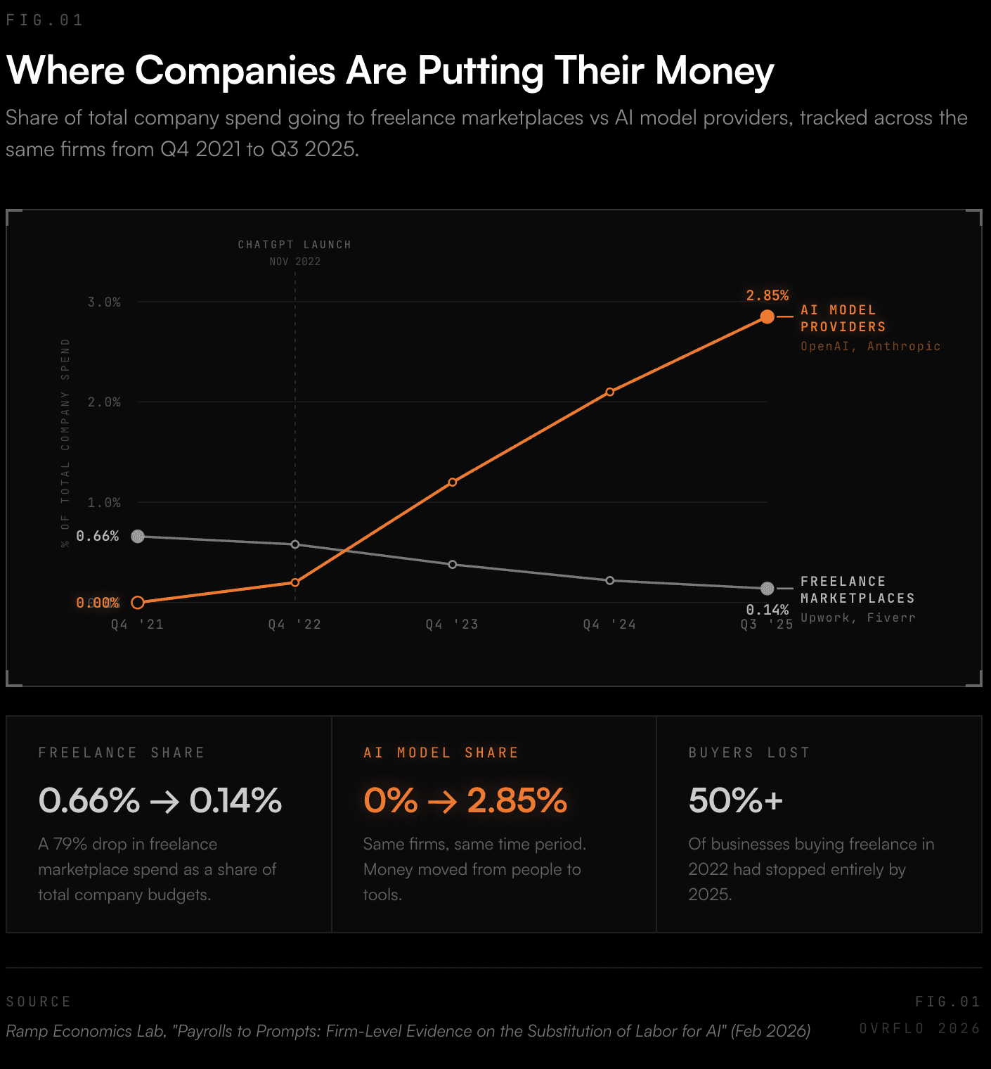 The Ramp "Payrolls to Prompts" study painted an even starker picture: more than half of businesses that were spending on freelance platforms in 2022 had stopped entirely by 2025. Freelance marketplace spending as a share of total company spend fell from 0.66% to 0.14%. AI model spending went from zero to 2.85%.
