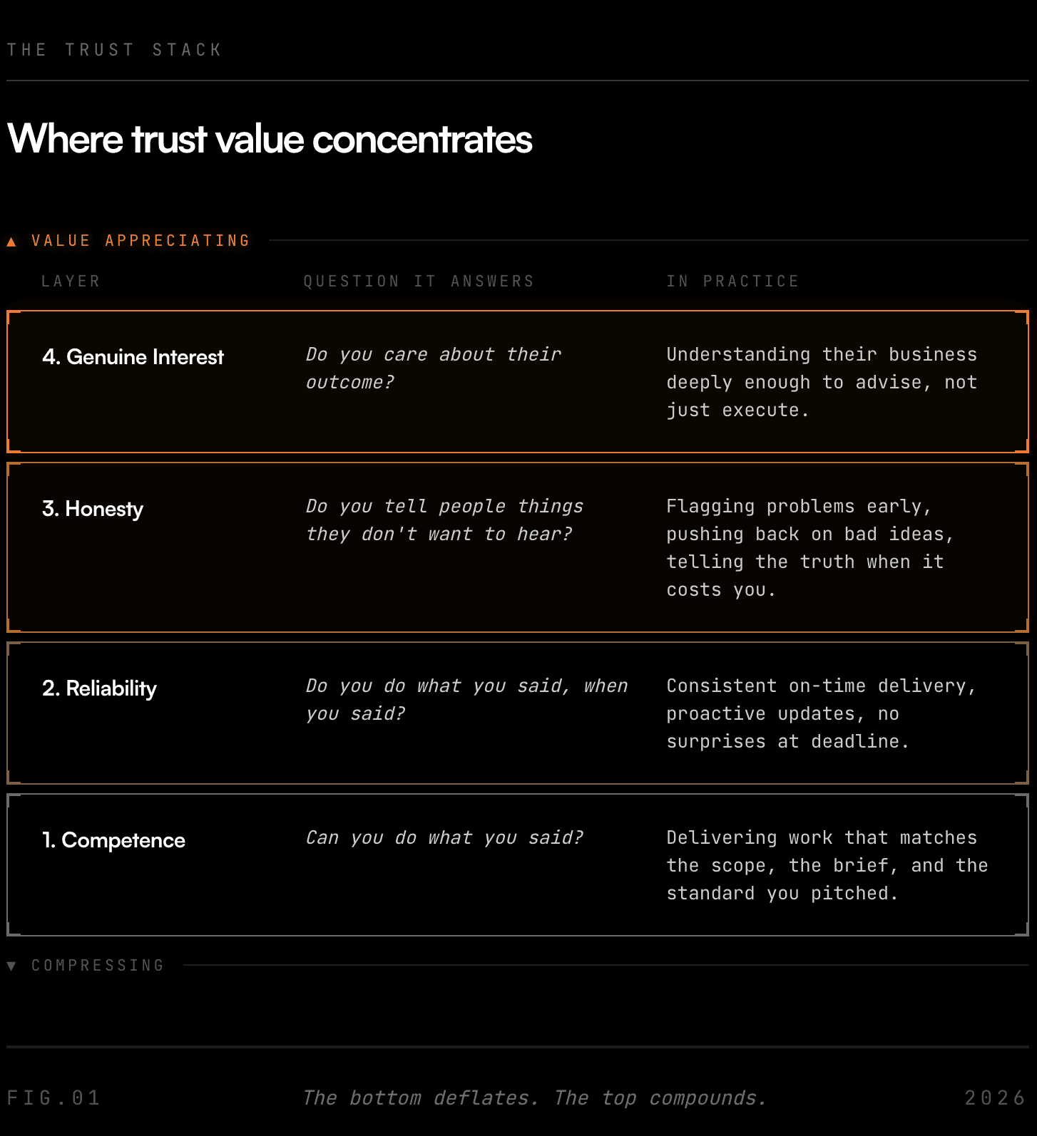 For 20 odd years, competence was the primary trust signal in client work. You demonstrated you knew what you were doing, the client believed you could deliver and the relationship kicked off. Your portfolio, extended case studies and credentials are all competence signals.